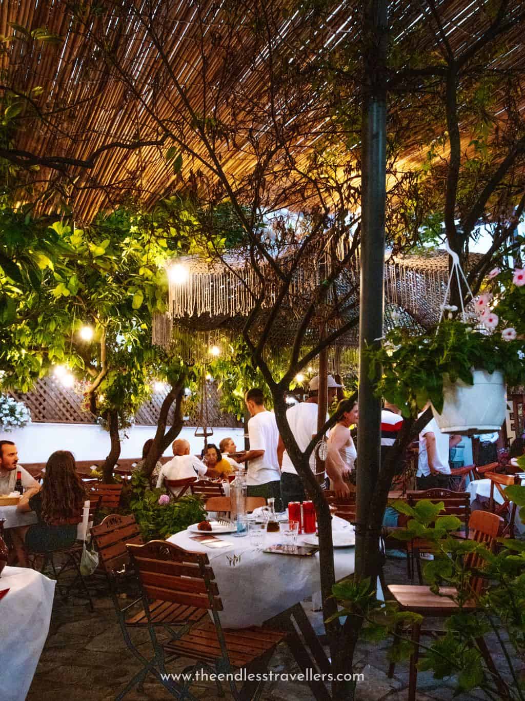 The restaurant serves traditional Albanian cuisine in a peaceful hidden garden in the centre of the city. The tables are surrounded by trees and trailing flowers, with fairy lights and lanterns dispersed throughout. The atmosphere is so romantic and peaceful.