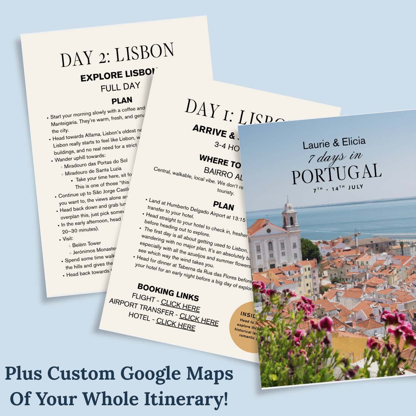 Each itinerary is delivered as a professionally designed PDF, ready to print or use digitally while travelling. You’ll also get a custom Google Map with every location pinned.